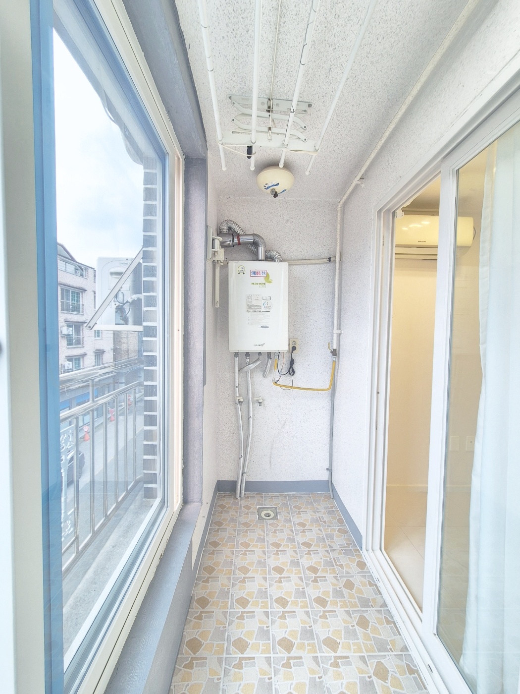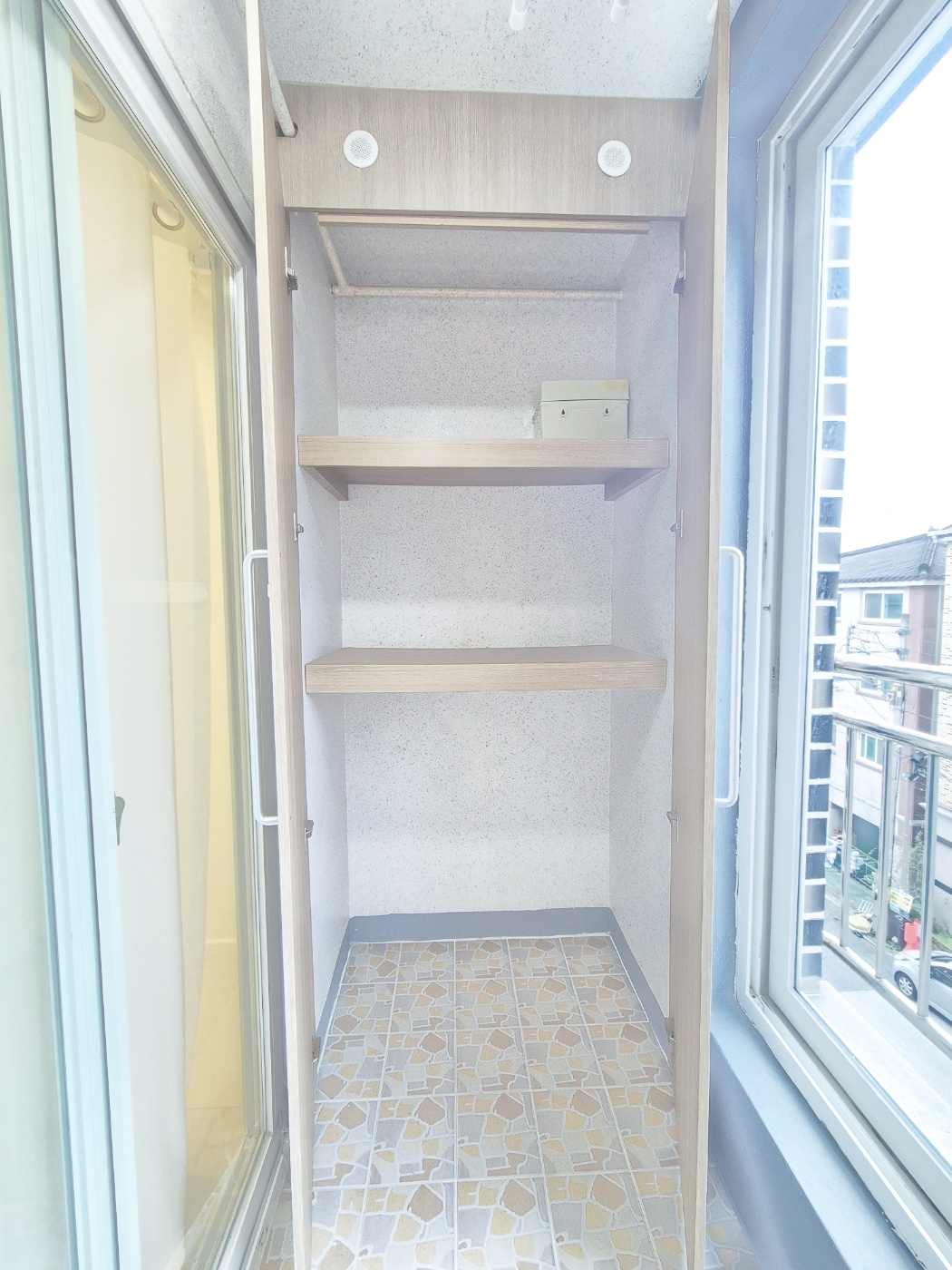 ◑ 베란다에 붙박이수납장이 설치되어있어요